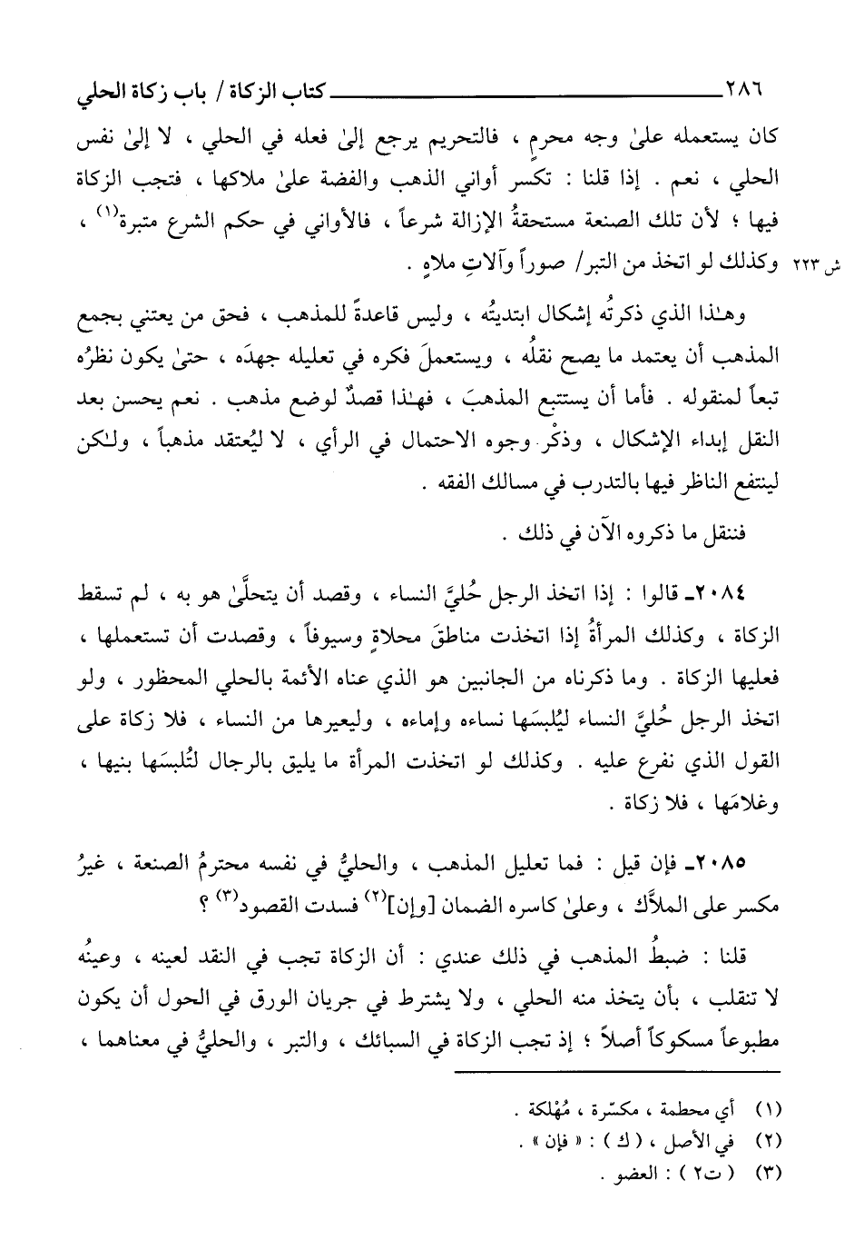 2085 - فإن قيل: فما تعليل المذهب، والحليُّ في نفسه محترمُ الصنعة، غيرُ مكسر على الملاَّك، وعلى كاسره الضمان [وإن] (2) فسدت القصود (3)؟
