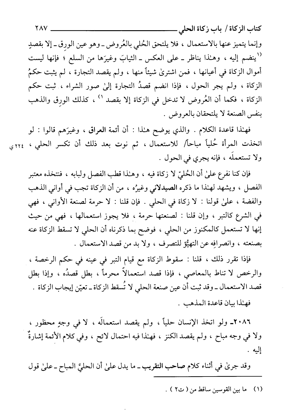 فهذا قاعدة الكلام. والذي يوضح هذا: أن أئمة العراق، وغيرَهم قالوا: لو اتخذت المرأة حُلياً مباحاً للاستعمال، ثم نوت بعد ذلك أن تكسر الحلي، ولا تستعملَه، فإنه يجري في الحول.