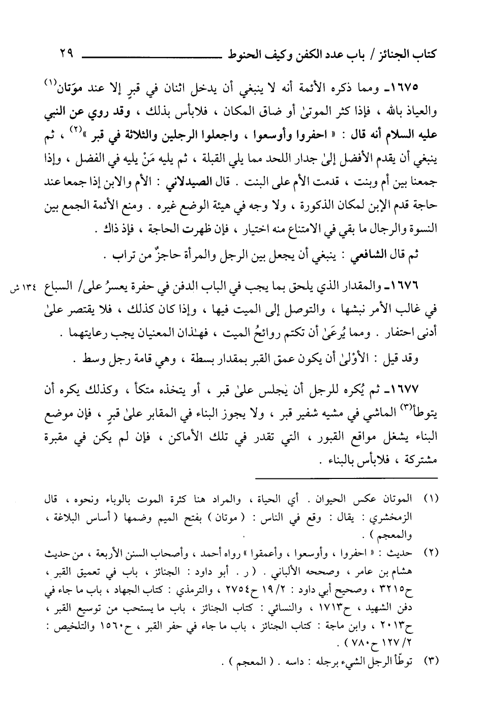 (2) حديث: "احفروا، وأوسعوا، وأعمقوا" رواه أحمد، وأصحاب السنن الأربعة، من حديث هشام بن عامر، وصححه الألباني. (ر. أبو داود: الجنائز، باب في تعميق القبر، ح 3215، وصحيح أبي داود: 2/ 19 ح 2754، والترمذي: كتاب الجهاد، باب ما جاء في دفن الشهيد، ح 1713، والنسائي: كتاب الجنائز، باب ما يستحب من توسيع القبر، ح 2013، وابن ماجة: كتاب الجنائز، باب ما جاء في حفر القبر، ح 1560 والتلخيص: 2/ 127 ح 780).