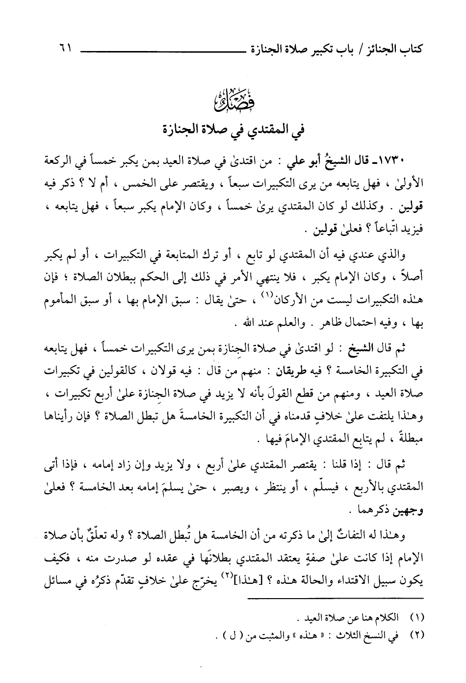 1730 - قال الشيخُ أبو علي: من اقتدى في صلاة العيد بمن يكبر خمساً في الركعة الأولى، فهل يتابعه من يرى التكبيرات سبعاً، ويقتصر على الخمس، أم لا؟ ذكر فيه قولين. وكذلك لو كان المقتدي يرى خمساً، وكان الإمام يكبر سبعاً، فهل يتابعه، فيزيد اتّباعاً؟ فعلى قولين.
