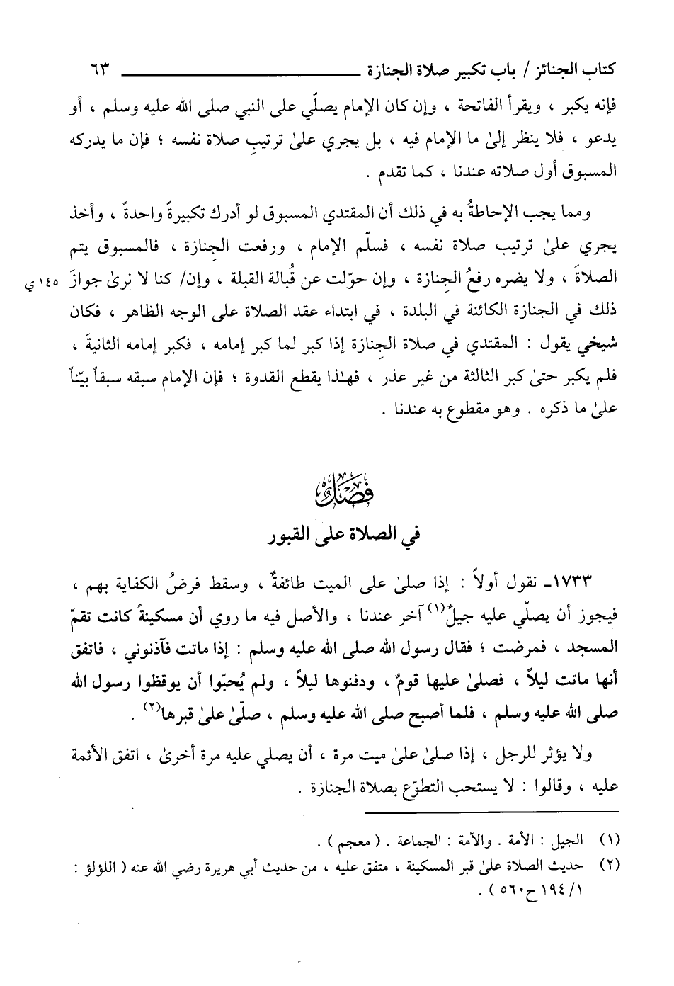 1733 - نقول أولاً: إذا صلى على الميت طائفة، وسقط فرضُ الكفاية بهم، فيجوز أن يصلّي عليه جيل (1) آخر عندنا، والأصل فيه ما روي أن مسكينةً كانت تقمّ المسجد، فمرضت؛ فقال رسول الله صلى الله عليه وسلم: إذا ماتت فآذنوني، فاتفق أنها ماتت ليلاً، فصلى عليها قوم، ودفنوها ليلاً، ولم يُحبّوا أن يوقظوا رسول الله صلى الله عليه وسلم، فلما أصبح صلى الله عليه وسلم، صلّى على قبرها (2).