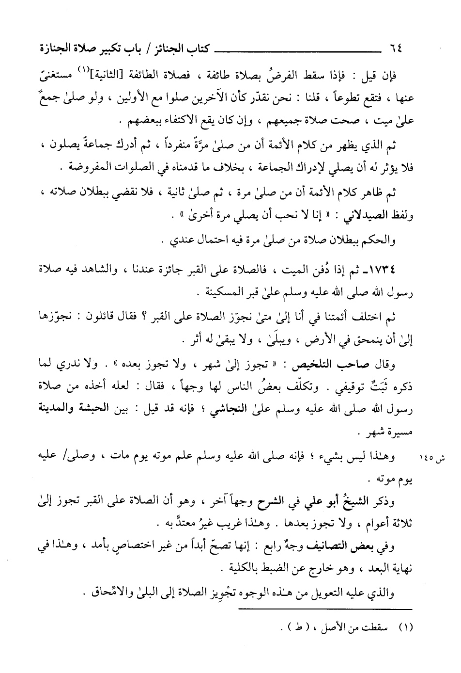 1734 - ثم إذا دُفن الميت، فالصلاة على القبر جائزة عندنا، والشاهد فيه صلاة رسول الله صلى الله عليه وسلم على قبر المسكينة.