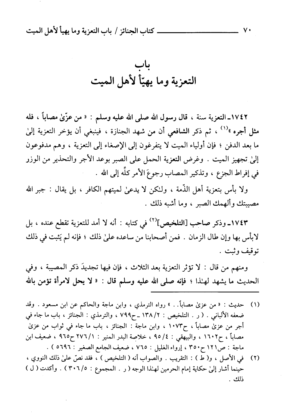 (1) حديث: "من عزى مصاباً .. " رواه الترمذي، وابن ماجة والحاكم عن ابن مسعود. وقد ضعفه الألباني. (ر. التلخيص: 2/ 138 - ح 799، والترمذي: الجنائز، باب ما جاء في أجر من عزى مصاباً، ح 1073، وابن ماجة: الجنائز، باب ما جاء في ثواب من عزى مصاباً، ح 1602، والبيهقي: 4/ 95، خلاجمة البدر المنير: 1/ 276 ح 965، ضعيف ابن ماجة: ص 121 ح 350، إرواء الغليل: 765، ضعيف الجامع الصغير: 5696).
