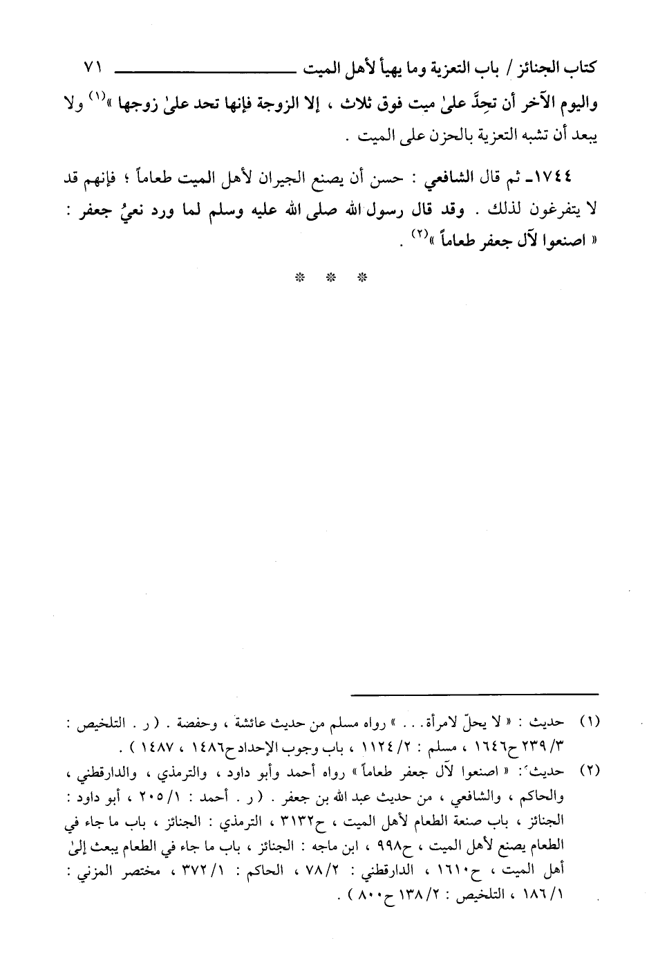 (2) حديث: "اصنعوا لآل جعفر طعاماً" رواه أحمد وأبو داود، والترمذي، والدارقطني، والحاكم، والشافعي، من حديث عبد الله بن جعفر. (ر. أحمد: 1/ 205، أبو داود: الجنائز، باب صنعة الطعام لأهل الميت، ح 3132، الترمذي: الجنائز، باب ما جاء في الطعام يصنع لأهل الميت، ح 998، ابن ماجه: الجنائز، باب ما جاء في الطعام يبعث إلى أهل الميت، ح 1610، الدارقطني: 2/ 78، الحاكم: 1/ 372، مختصر المزني: 1/ 186، التلخيص: 2/ 138 ح 800).