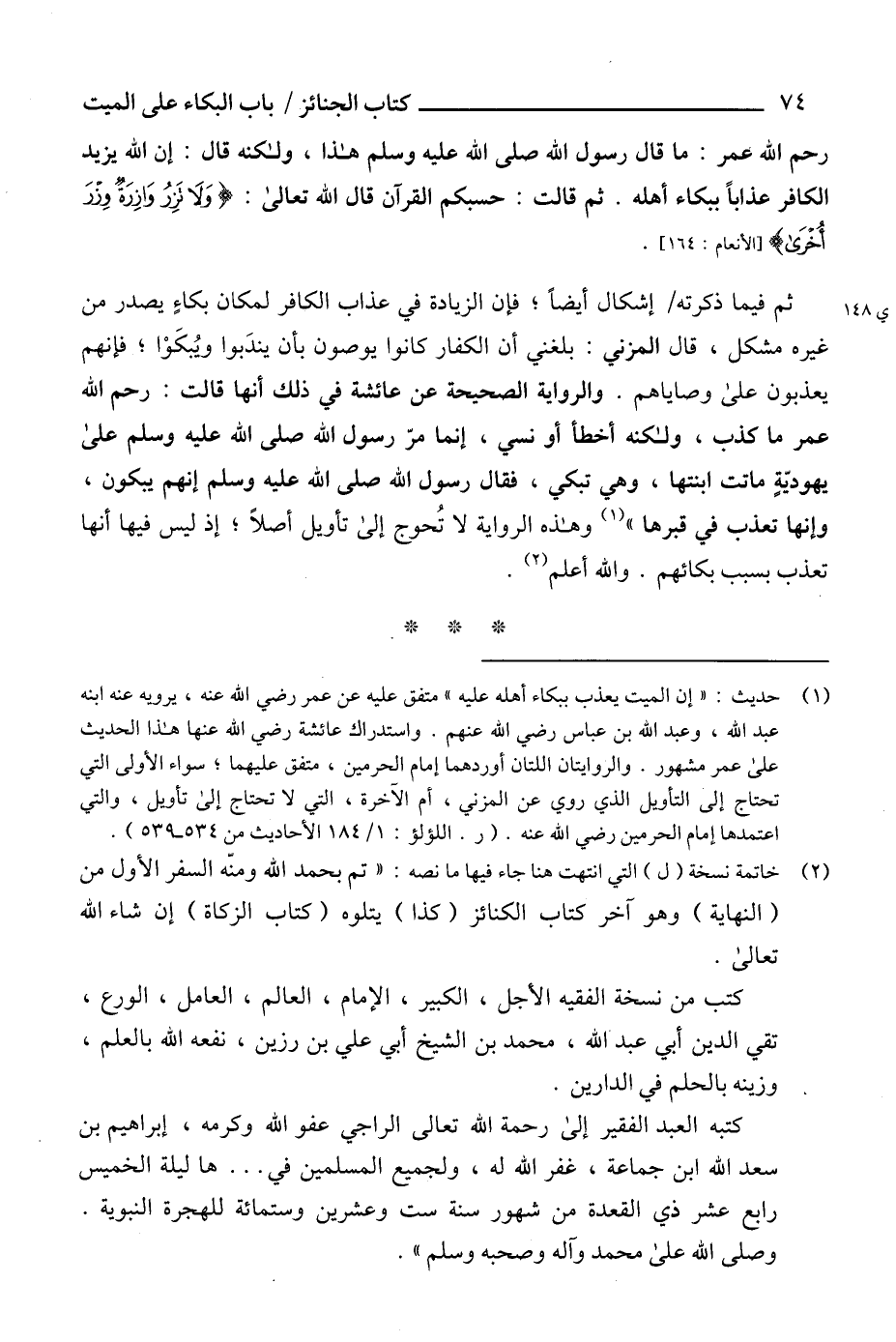 (1) حديث: "إن الميت يعذب ببكاء أهله عليه" متفق عليه عن عمر رضي الله عنه، يرويه عنه ابنه عبد الله، وعبد الله بن عباس رضي الله عنهم. واستدراك عائشة رضي الله عنها هذا الحديث على عمر مشهور. والروايتان اللتان أوردهما إمام الحرمين، متفق عليهما؛ سواء الأولى التي تحتاج إلى التأويل الذي روي عن المزني، أم الآخرة، التي لا تحتاج إلى تأويل، والتي اعتمدها إمام الحرمين رضي الله عنه. (ر. اللؤلؤ: 1/ 184 الأحاديث من 534 - 539).
