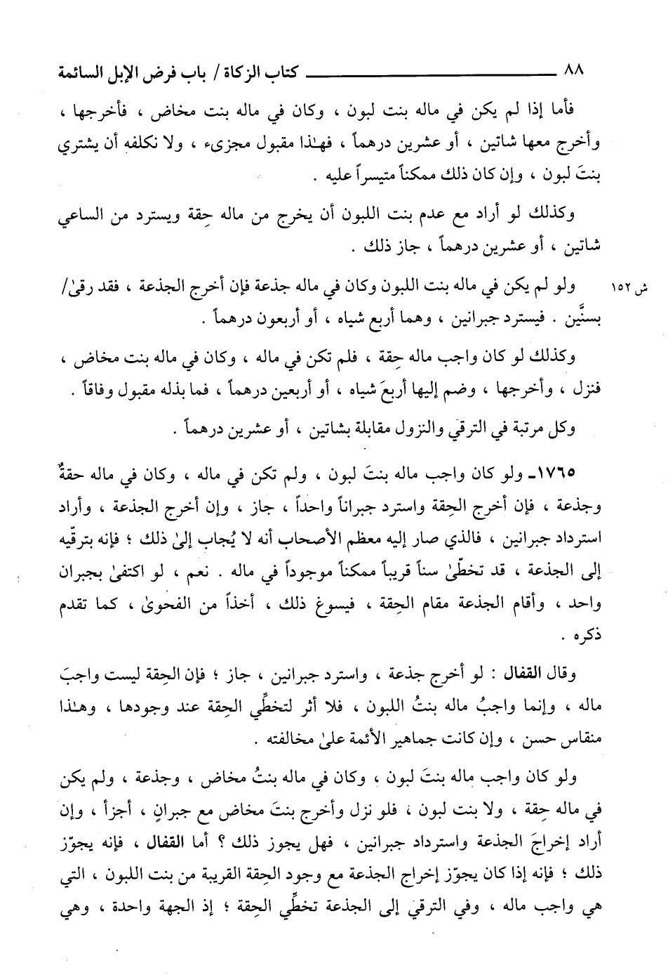 1765 - ولو كان واجب ماله بنتَ لبون، ولم تكن في ماله، وكان في ماله حقة وجذعة، فإن أخرج الحِقة واسترد جبراناً واحداً، جاز، وإن أخرج الجذعة، وأراد استرداد جبرانين، فالذي صار إليه معظم الأصحاب أنه لا يُجاب إلى ذلك؛ فإنه بترقّيه إلى الجذعة، قد تخطّى سناً قريباً ممكناً موجوداً في ماله. نعم، لو اكتفى بجبران واحد، وأقام الجذعة مقام الحِقة، فيسوغ ذلك، أخذاً من الفحوى، كما تقدم ذكره.