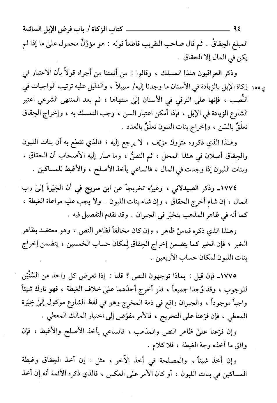 1774 - وذكر الصيدلاني، وغيرُه تخريجاً عن ابن سريج في أن الخِيَرةَ إلى رب المال، إن شاء أخرج الحقاق، وإن شاء بنات اللبون. ولا يجب عليه مراعاة الغبطة، كما أنه في ظاهر المذهب يتخيّر في الجبران. وقد تقدم التفصيل فيه.