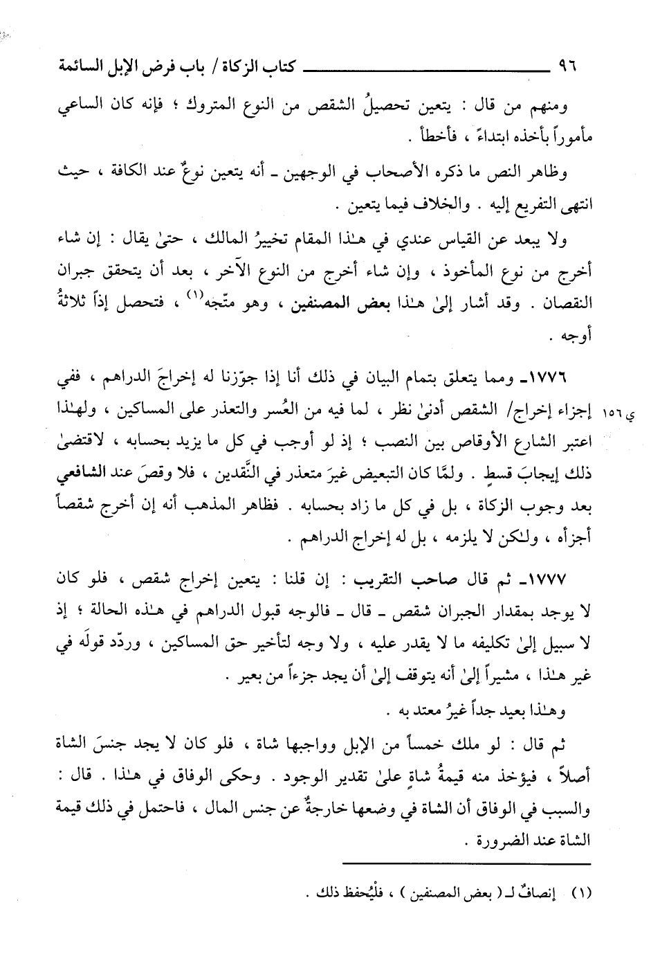 1776 - ومما يتعلق بتمام البيان في ذلك أنا إذا جوّزنا له إخراجَ الدراهم، ففي إجزاء إخراج الشقص أدنى نظر، لما فيه من العُسر والتعذر على المساكين، ولهذا اعتبر الشارع الأوقاص بين النصب؛ إذ لو أوجب في كل ما يزيد بحسابه، لاقتضى ذلك إيجابَ قسطٍ. ولمَّا كان التبعيض غيرَ متعذر في النَّقدين، فلا وقصَ عند الشافعي بعد وجوب الزكاة، بل في كل ما زاد بحسابه. فظاهر المذهب أنه إن أخرج شقصاً أجزأه، ولكن لا يلزمه، بل له إخراج الدراهم.