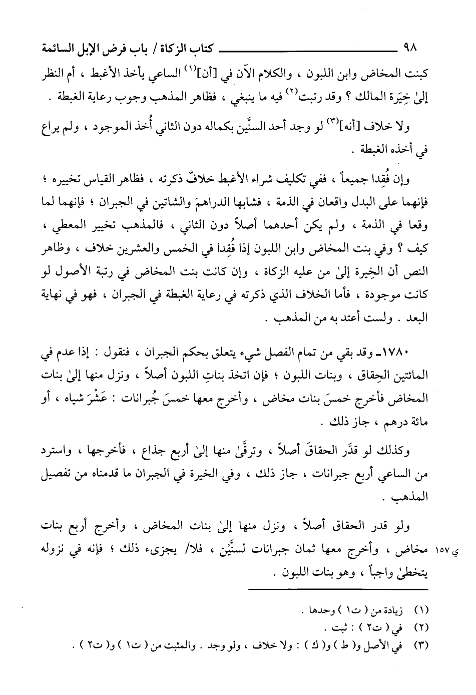 1780 - وقد بقي من تمام الفصل شيء يتعلق بحكم الجبران، فنقول: إذا عدم في المائتين الحِقاق، وبنات اللبون؛ فإن اتخذ بناتِ اللبون أصلاً، ونزل منها إلى بنات المخاض فأخرج خمسَ بنات مخاض، وأخرج معها خمسَ جُبرانات: عَشْرَ شياه، أو مائة درهم، جاز ذلك.