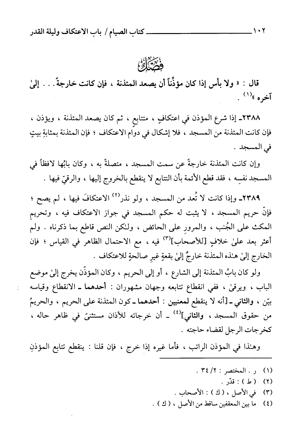 2388 - إذا شرع المؤذن في اعتكافٍ، متتابعٍ، ثم كان يصعد المئذنة، ويؤذن، فإن كانت المئذنة من المسجد، فلا إشكال في دوام الاعتكاف؛ فإن المئذنة بمثابةِ بيتٍ في المسجد.
