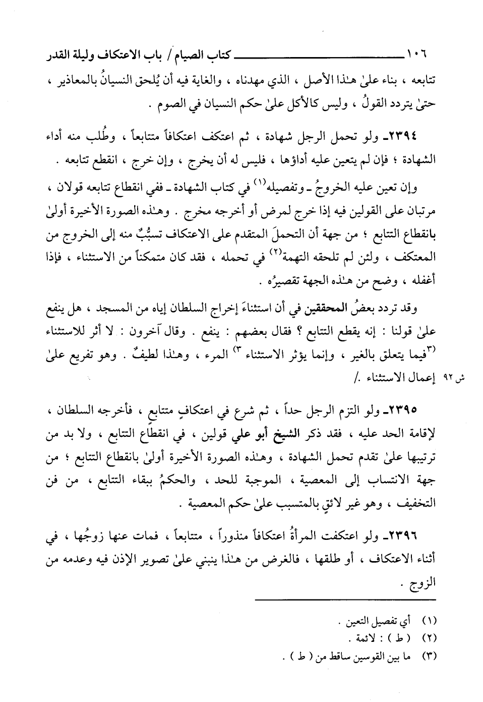 2396 - ولو اعتكفت المرأةُ اعتكافاً منذوراً، متتابعاً، فمات عنها زوجُها، في أثناء الاعتكاف، أو طلقها، فالغرض من هذا ينبني على تصوير الإذن فيه وعدمه من الزوج.