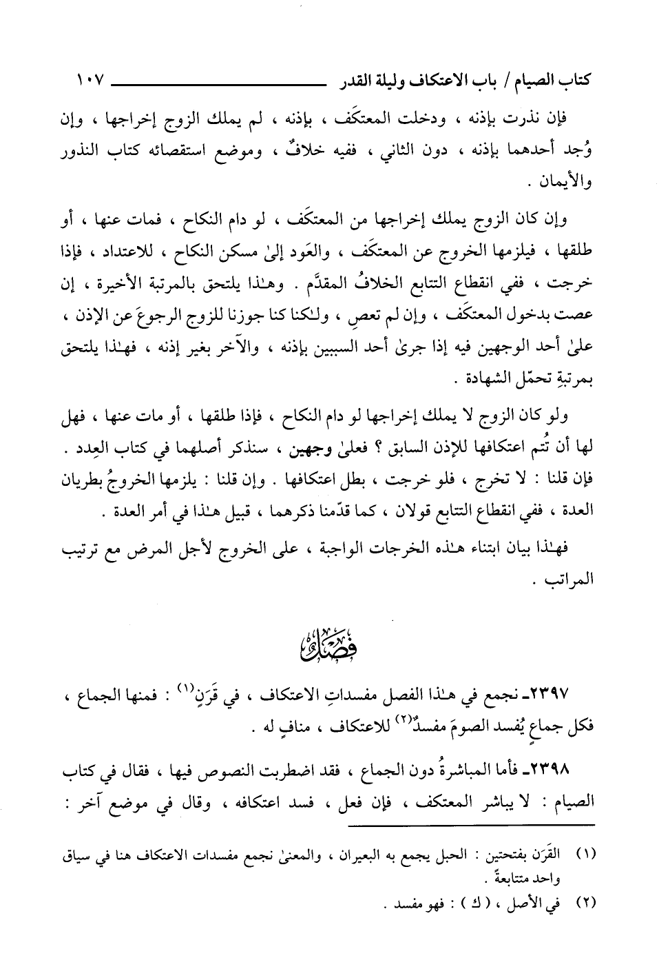 2397 - نجمع في هذا الفصل مفسداتِ الاعتكاف، في قَرَنٍ (1): فمنها الجماع، فكل جماعٍ يُفسد الصومَ مفسدٌ (2) للاعتكاف، منافٍ له.