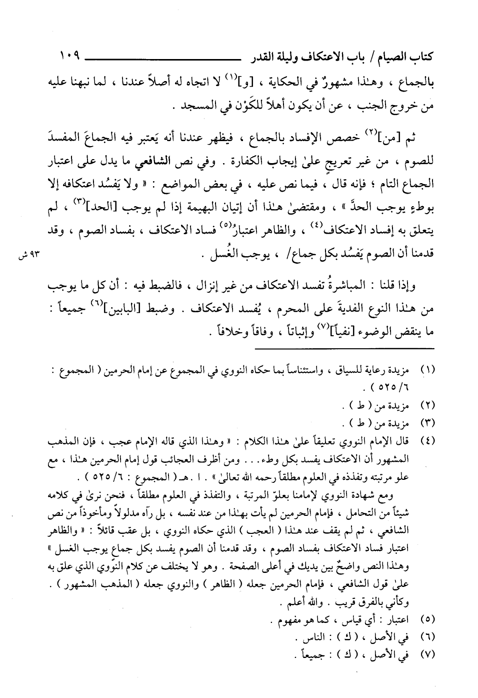 (4) قال الإمام النووي تعليقاً على هذا الكلام: " وهذا الذي قاله الإمام عجب، فإن المذهب المشهور أن الاعتكاف يفسد بكل وطء ... ومن أظرف العجائب قول إمام الحرمين هذا، مع علو مرتبته وتفذذه في العلوم مطلقاً رحمه الله تعالى ". ا. هـ (المجموع: 6/ 525).