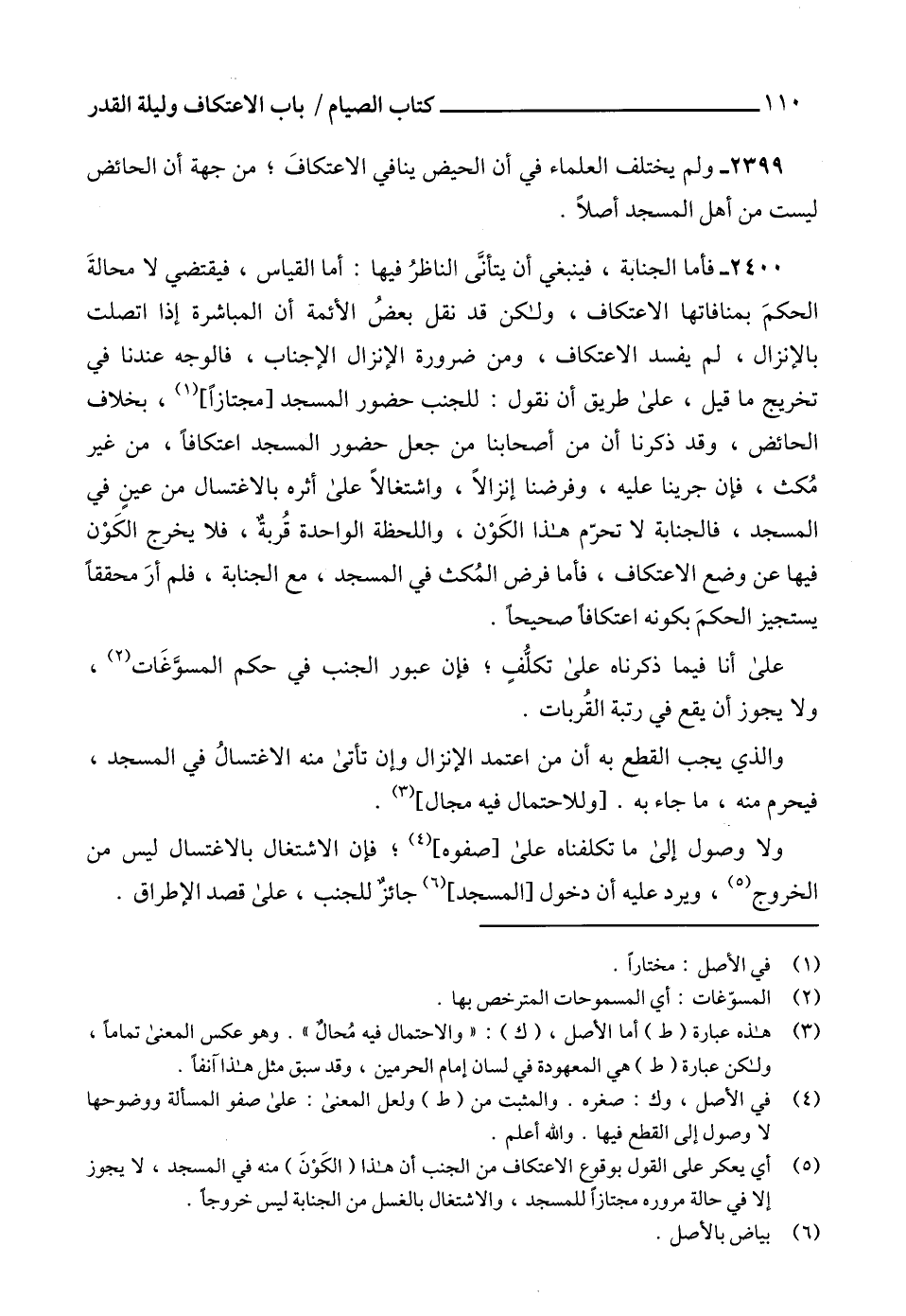 (5) أي يعكر على القول بوقوع الاعتكاف من الجنب أن هذا (الكَوْنَ) منه في المسجد، لا يجوز إلا في حالة مروره مجتازاً للمسجد، والاشتغال بالغسل من الجنابة ليس خروجاً.