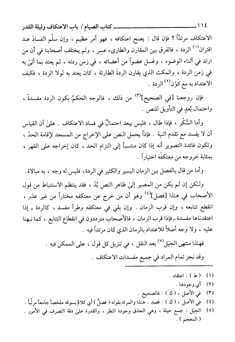 الاعتكاف مرتدّاً؟ فإن قال: يصح اعتكافه، فهو أمر عظيم، وإن سلّم الفسادَ عند اقتران (1) الردة، فالفرق بين المقارن والطارئ عسِر، ولم يختلف أصحابنا في أن من ارتد في أثناء الوضوء، وغسل عضواً من أعضائه، في زمن ردته، لم يعتد بما أتى به في زمن الردة، والمكث الذي يقارن الردةَ الطارئة، كان يعتد به لولا الردة، فكيف الاعتداد به مع كَوْن (2) الردة.