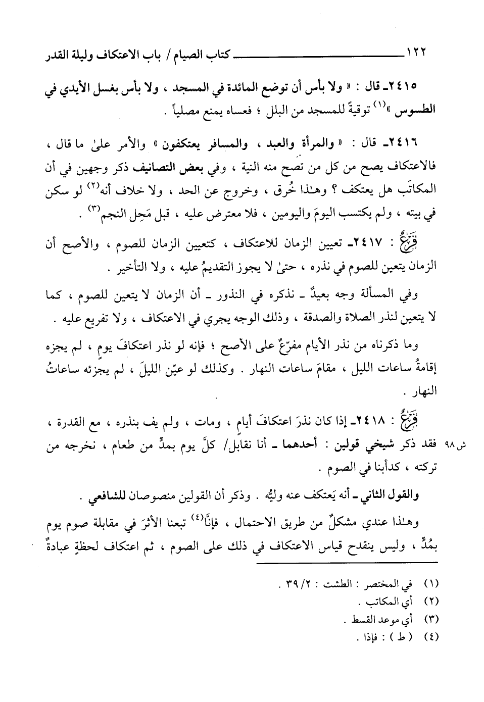 2417 - تعيين الزمان للاعتكاف، كتعيين الزمان للصوم، والأصح أن الزمان يتعين للصوم في نذره، حتى لا يجوز التقديمُ عليه، ولا التأخير.