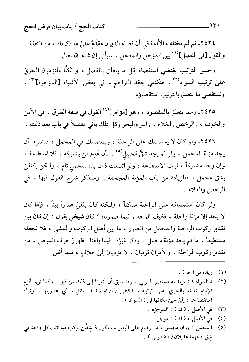 2425 - ومما يتعلق بالمقصود، وهو [مؤخر] (4) القول في صفة الطرق، في الأمن والخوف، والرخص والغلاء، والبر والبحر وكل ذلك يأتي مفصلاً في باب بعد ذلك.