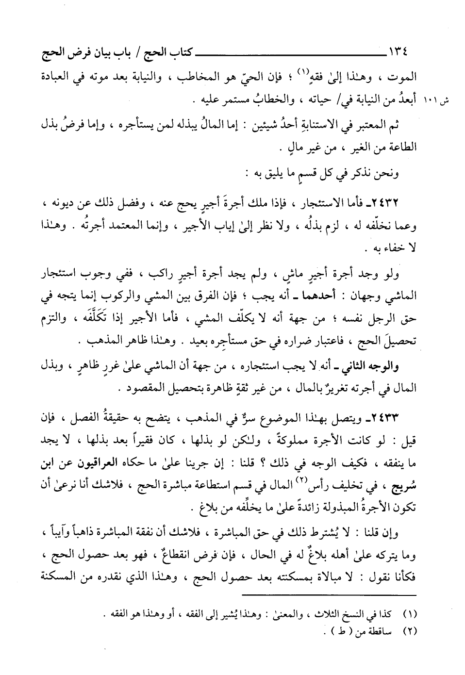 2433 - ويتصل بهذا الموضوع سرٌّ في المذهب، يتضح به حقيقةُ الفصل، فإن قيل: لو كانت الأجرة مملوكةً، ولكن لو بذلها، كان فقيراً بعد بذلها، لا يجد ما ينفقه، فكيف الوجه في ذلك؟ قلنا: إن جرينا على ما حكاه العراقيون عن ابن سُريج، في تخليف رأس (2) المال في قسم استطاعة مباشرة الحج، فلا شك أنا نرعى أن تكون الأجرةُ المبذولة زائدةً على ما يخلِّفه من بلاغ.