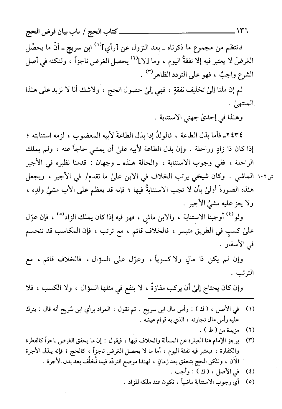 (5) أي وجوب الاستنابة ماشياً، تكون عند ملكه للزاد.