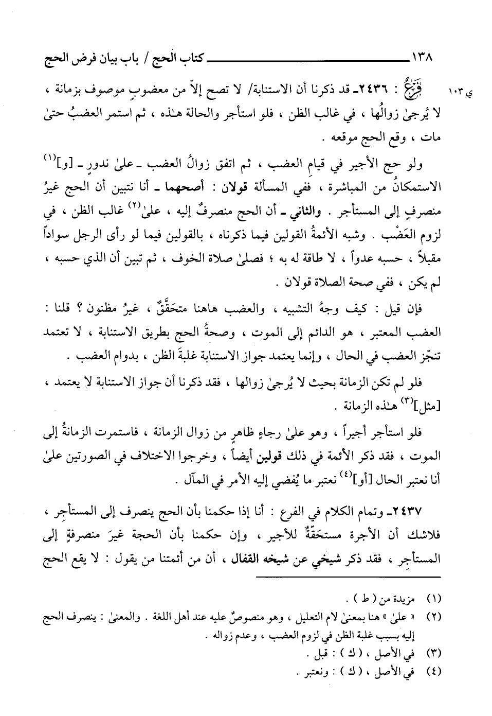 (2) " على " هنا بمعنى لام التعليل، وهو منصوصٌ عليه عند أهل اللغة. والمعنى: ينصرف الحج إليه بسبب غلبة الظن في لزوم العضب، وعدم زواله.