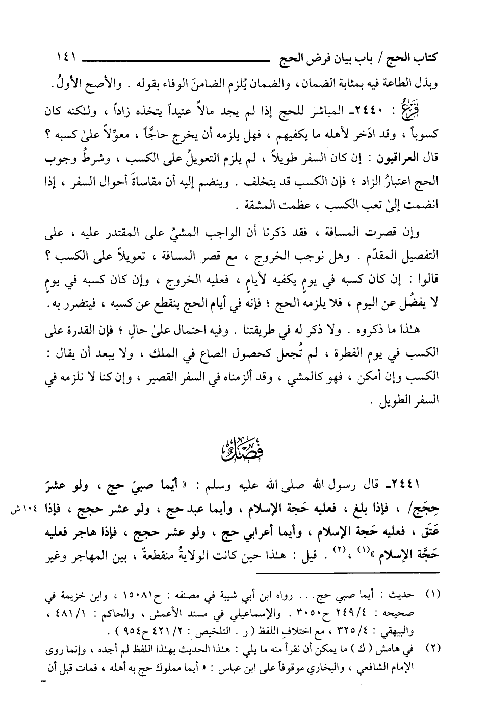 (1) حديث: أيما صبي حج ... رواه ابن أبي شيبة في مصنفه: ح 15081، وابن خزيمة في صحيحه: 4/ 249 ح 3050. والإسماعيلي في مسند الأعمش، والحاكم: 1/ 481، والبيهقي: 4/ 325، مع اختلافِ اللفظ (ر. التلخيص: 2/ 421 ح 954).