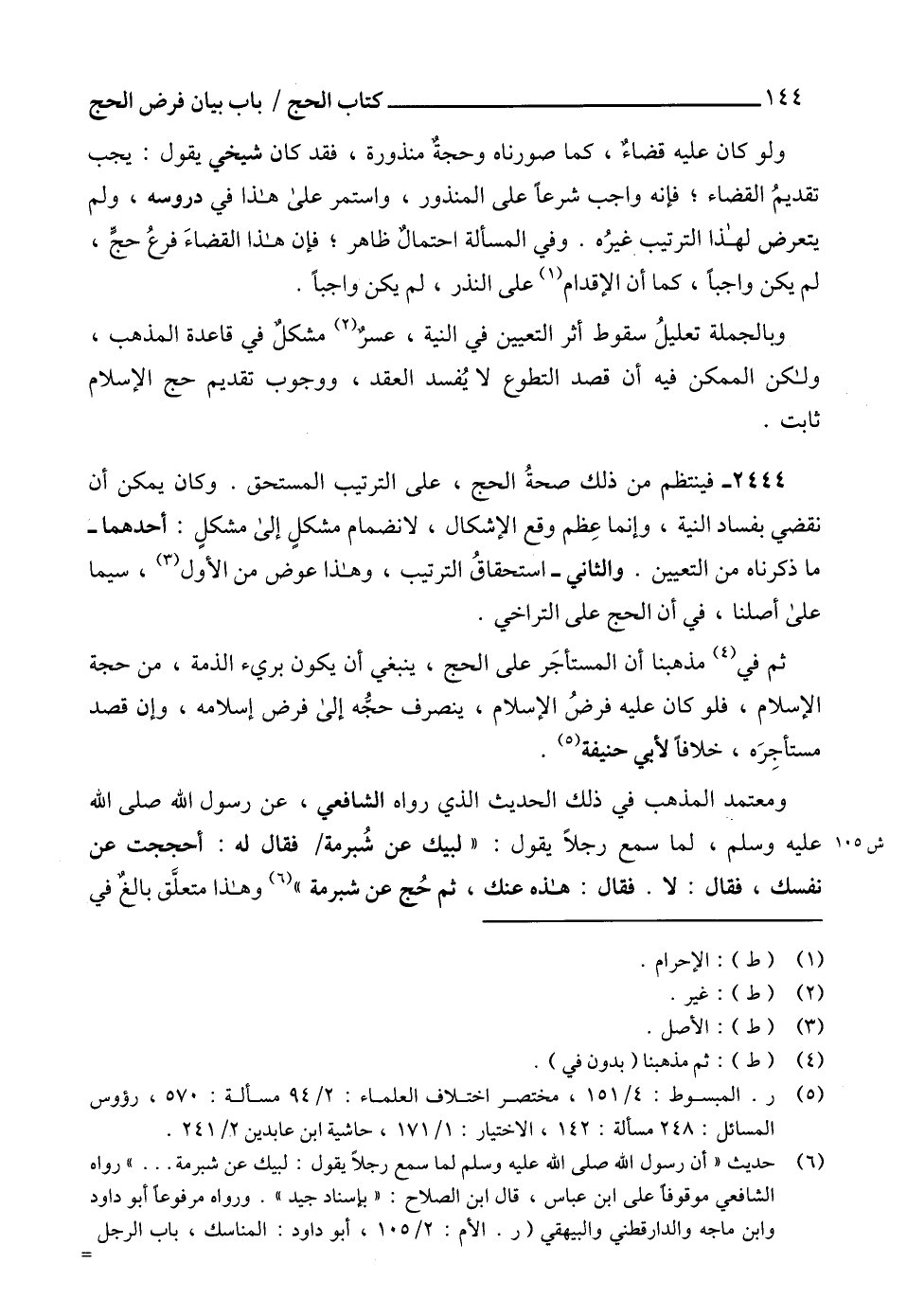ومعتمد المذهب في ذلك الحديث الذي رواه الشافعي، عن رسول الله صلى الله عليه وسلم، لما سمع رجلاً يقول: " لبيك عن شُبرمة فقال له: أحججت عن نفسك، فقال: لا. فقال: هذه عنك، ثم حُج عن شبرمة " (6) وهذا متعلَّق بالغٌ في