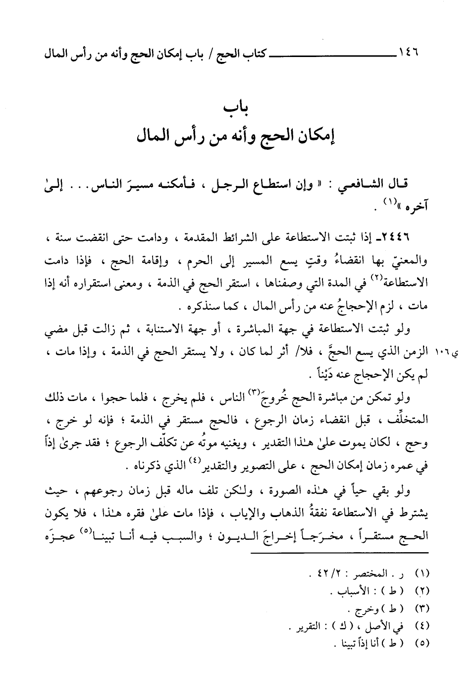 2446 - إذا ثبتت الاستطاعة على الشرائط المقدمة، ودامت حتى انقضت سنة، والمعنيّ بها انقضاءُ وقتٍ يسع المسير إلى الحرم، وإقامة الحج، فإذا دامت الاستطاعة (2) في المدة التي وصفناها، استقر الحج في الذمة، ومعنى استقراره أنه إذا مات، لزم الإحجاجُ عنه من رأس المال، كما سنذكره.