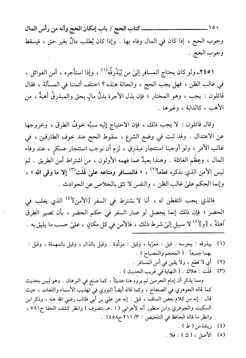 2451 - ولو كان يحتاج المسافر إلى من يُبَذْرِقُه (1)، وإذا استأجره، أمن الغوائل، في غالب الظن، فهل يجب الحج، والحالة هذه؟ اختلف أئمتنا في المسألة، فقال قائلون: يجب، وهو المختار، فإن بذل الأجرة بذلُ مالٍ بحق والمبذرِقُ أهبةٌ، من الأهب، كالدابة، وغيرها.