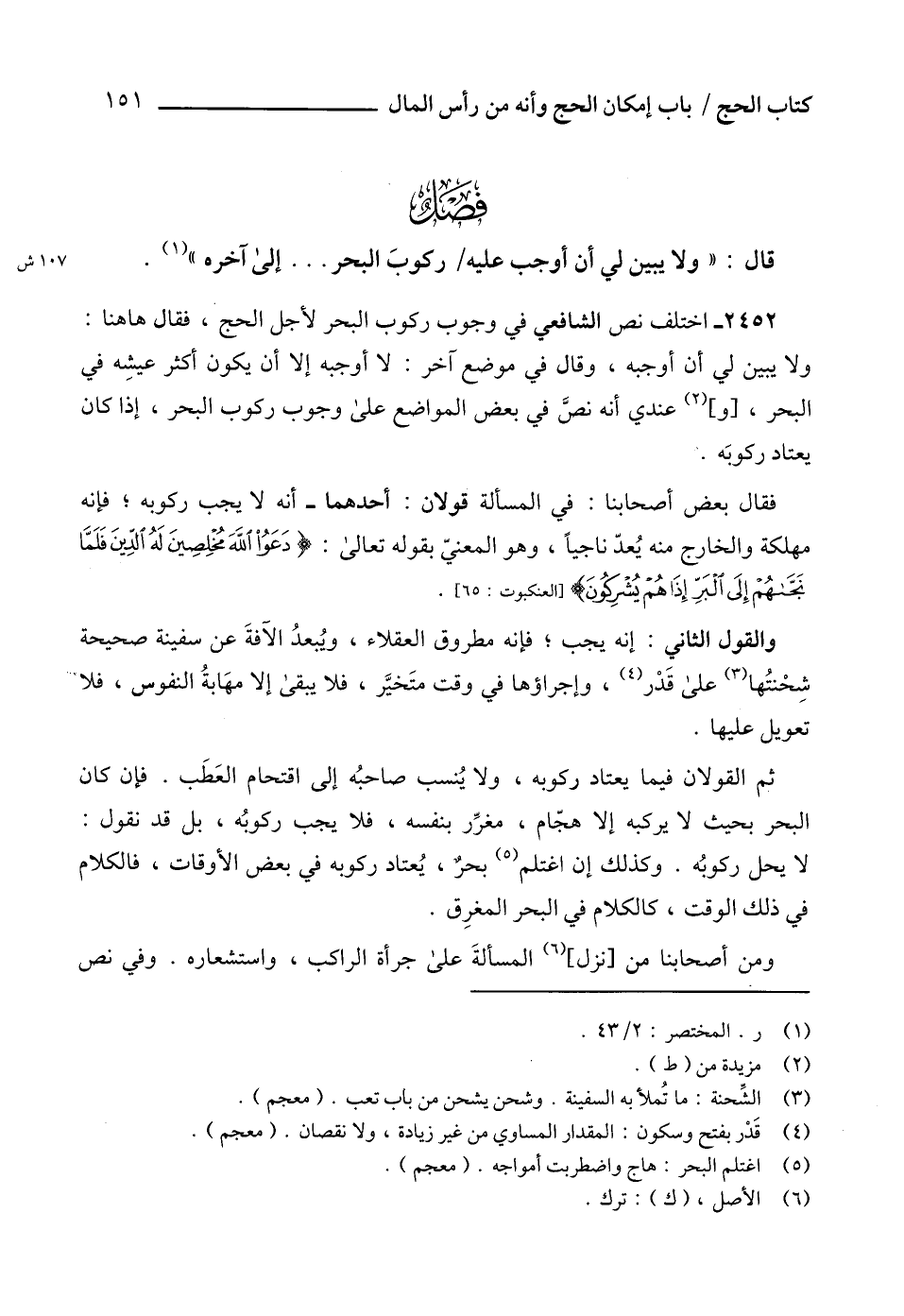 2452 - اختلف نص الشافعي في وجوب ركوب البحر لأجل الحج، فقال هاهنا: ولا يبين لي أن أوجبه، وقال في موضع آخر: لا أوجبه إلا أن يكون أكثر عيشِه في البحر، [و] (2) عندي أنه نصَّ في بعض المواضع على وجوب ركوب البحر، إذا كان يعتاد ركوبَه.