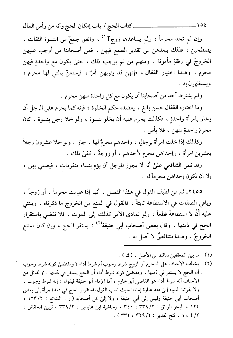 ولا يفوتنا التنبيه إلى دقة عبارة إمامنا حيث نسب القول باستقرار الحج في ذمة المرأة إلى بعض أصحاب أبي حنيفة وليس إلى أبي حنيفة، ولا إلى كل أصحابه (ر. البدائع: 2/ 123، 124، البحر الرائق: 2/ 339، 340، وحاشية ابن عابدين: 2/ 339، تبيين الحقائق: 2/ 4، 6، فتح القدير: 2/ 329، 332).
