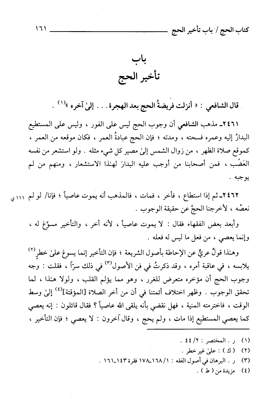 2461 - مذهب الشافعي أن وجوب الحج ليس على الفور، وليس على المستطيع البدارُ إليه وعمره فسحته، ومدته؛ فإن الحج عبادةُ العمر، فكان موقعه من العمر، كموقع صلاة الظهر، من زوال الشمس إلى مصير كل شيء مثله. ولو استشعر من نفسه العَضْب، فمن أصحابنا من أوجب عليه البدارَ لهذا الاستشعار، ومنهم من لم يوجبه.