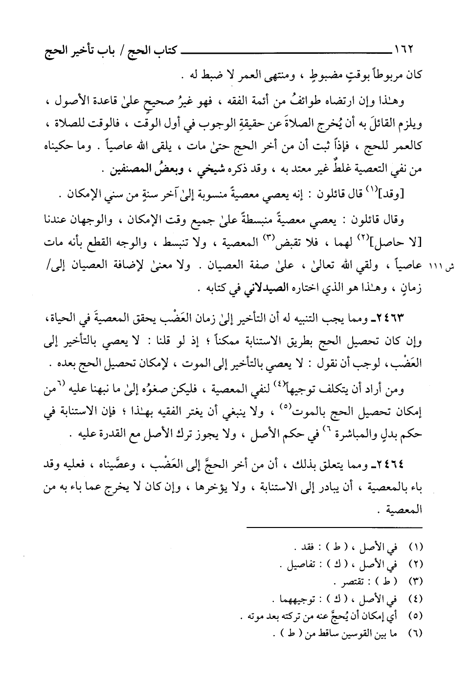 2464 - ومما يتعلق بذلك، أن من أخر الحجَّ إلى العَضْب، وعصَّيناه، فعليه وقد باء بالمعصية، أن يبادر إلى الاستنابة، ولا يؤخرها، وإن كان لا يخرج عما باء به من المعصية.