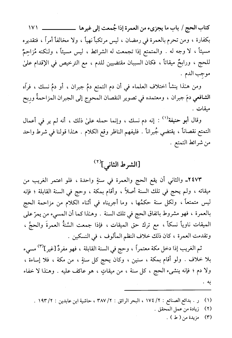 وقال أبو حنيفة (1): إنه دم نسك، وإنما حمله على ذلك، أنه لم ير في أعمال التمتع نقصاناً، يقتضي جُبراناً. فليفهم الناظر وقع الكلام. هذا قولينا في شرط واحد من شرائط التمتع.