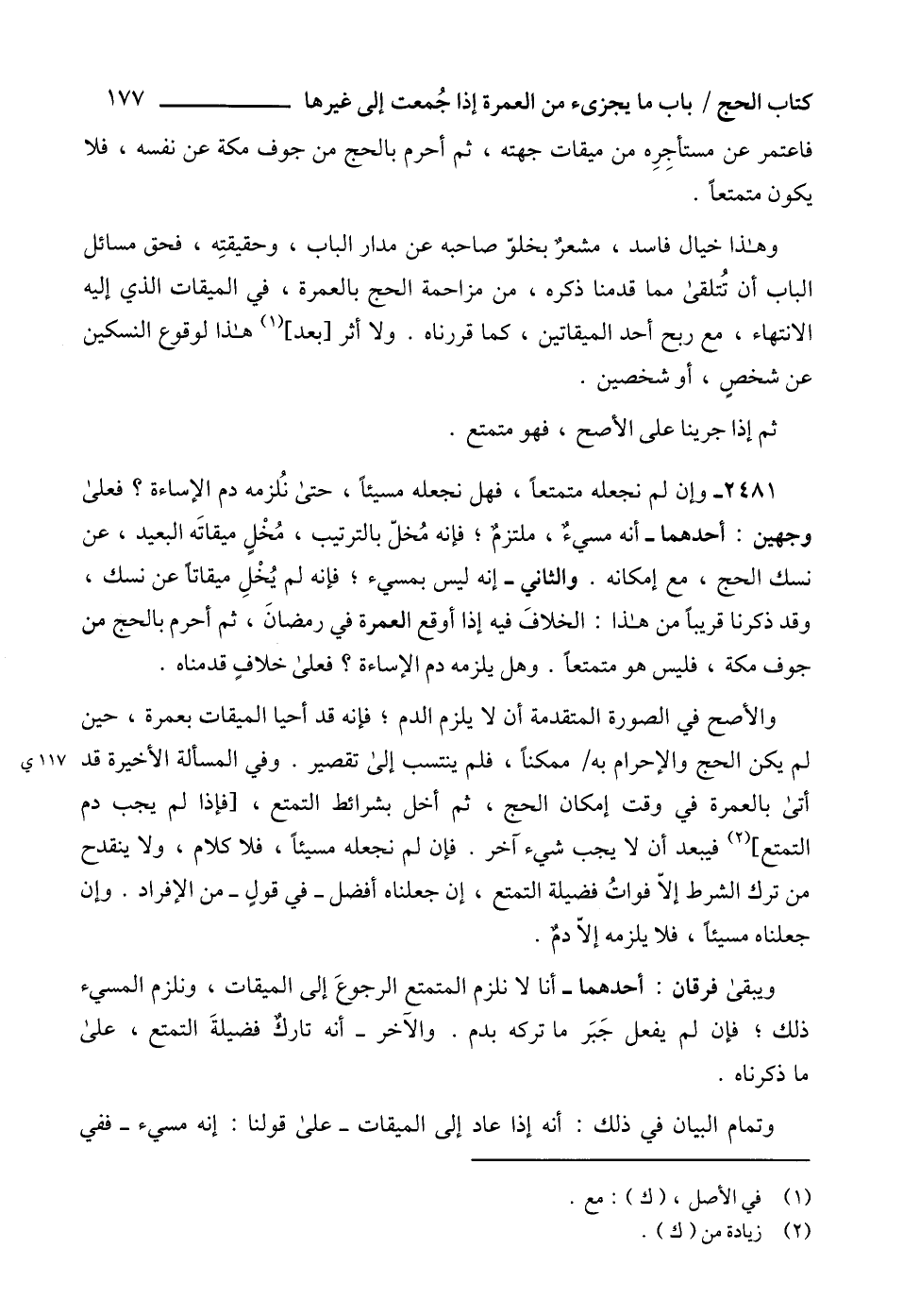 2481 - وإن لم نجعله متمتعاً، فهل نجعله مسيئاً، حتى نُلزمه دم الإساءة؟ فعلى وجهين: أحدهما - أنه مسيءٌ، ملتزمٌ؛ فإنه مُخلّ بالترتيب، مُخْلٍ ميقاتَه البعيد، عن نسك الحج، مع إمكانه. والثاني - إنه ليس بمسيء؛ فإنه لم يُخْلِ ميقاتاً عن نسك، وقد ذكرنا قريباً من هذا: الخلافَ فيه إذا أوقع العمرة في رمضانَ، ثم أحرم بالحج من جوف مكة، فليس هو متمتعاًً. وهل يلزمه دم الإساءة؟ فعلى خلافٍ قدمناه.
