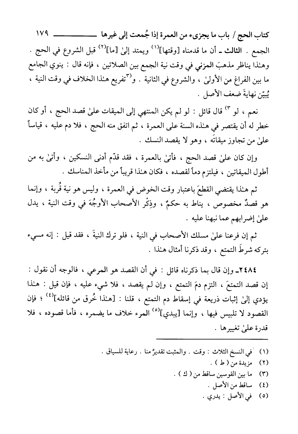 الجمع. الثالث - أن ما قدمناه [وقتها] (1) ويمتد إلى [ما] (2) قبل الشروع في الحج. وهذا يناظر مذهبَ المزني في وقت نية الجمع بين الصلاتين، فإنه قال: ينوي الجامع ما بين الفراغ من الأولى، والشروع في الثانية. و (3 تفريع هذا الخلاف في وقت النية، يُبيّن نهايةَ ضعف الأصل.