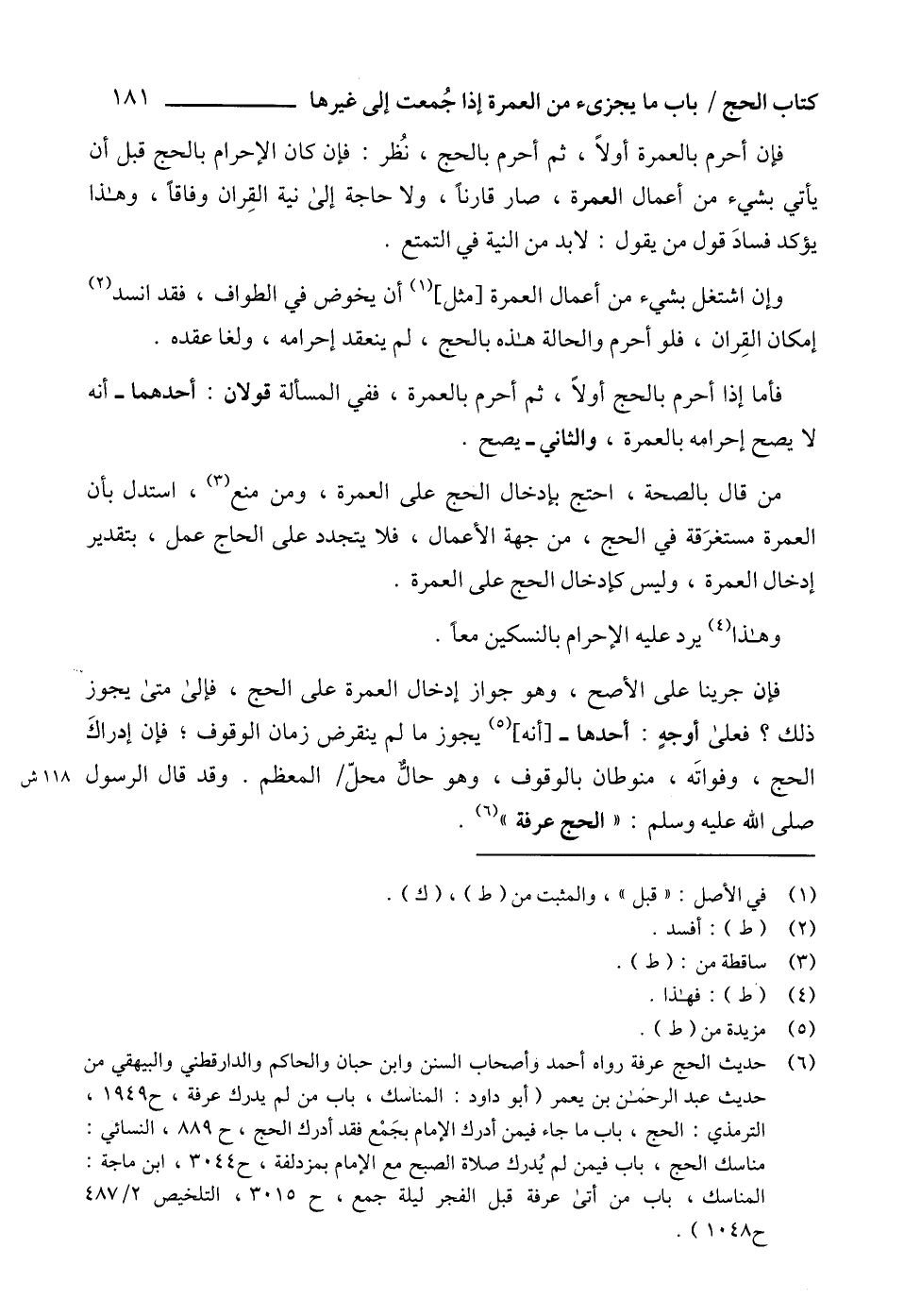 (6) حديث الحج عرفة رواه أحمد وأصحاب السنن وابن حبان والحاكم والدارقطني والبيهقي من حديث عبد الرحمن بن يعمر (أبو داود: المناسك، باب من لم يدرك عرفة، ح 1949، الترمذي: الحج، باب ما جاء فيمن أدرك الإمام بجَمْع فقد أدرك الحج، ح 889، النسائي: مناسك الحج، باب فيمن لم يُدرك صلاة الصبح مع الإمام بمزدلفة، ح 3044، ابن ماجة: المناسك، باب من أتى عرفة قبل الفجر ليلة جمع، ح 3015، التلخيص 2/ 487 ح 1048).