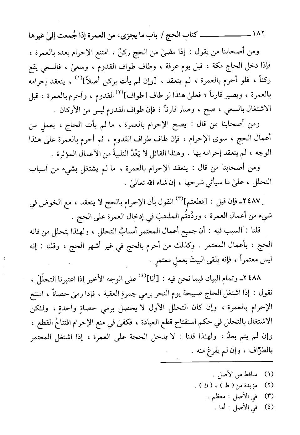 2487 - فإن قيل: [قطعتم] (3) القول بأن الإحرام بالحج لا ينعقد، مع الخوض في شيء من أعمال العمرة، وردَّدتُم المذهبَ في إدخال العمرة على الحج.