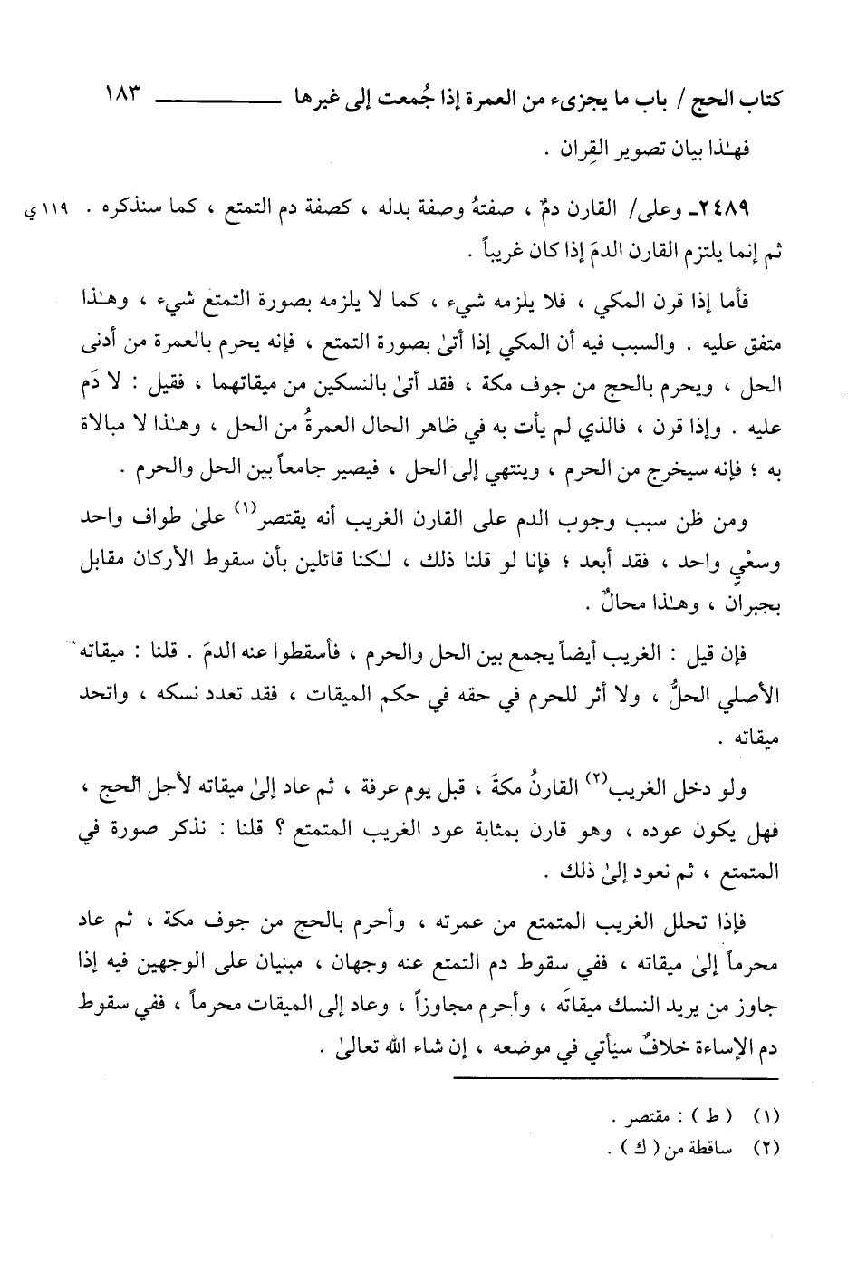2489 - وعلى القارن دمٌ، صفتهُ وصفة بدله، كصفة دم التمتع، كما سنذكره.