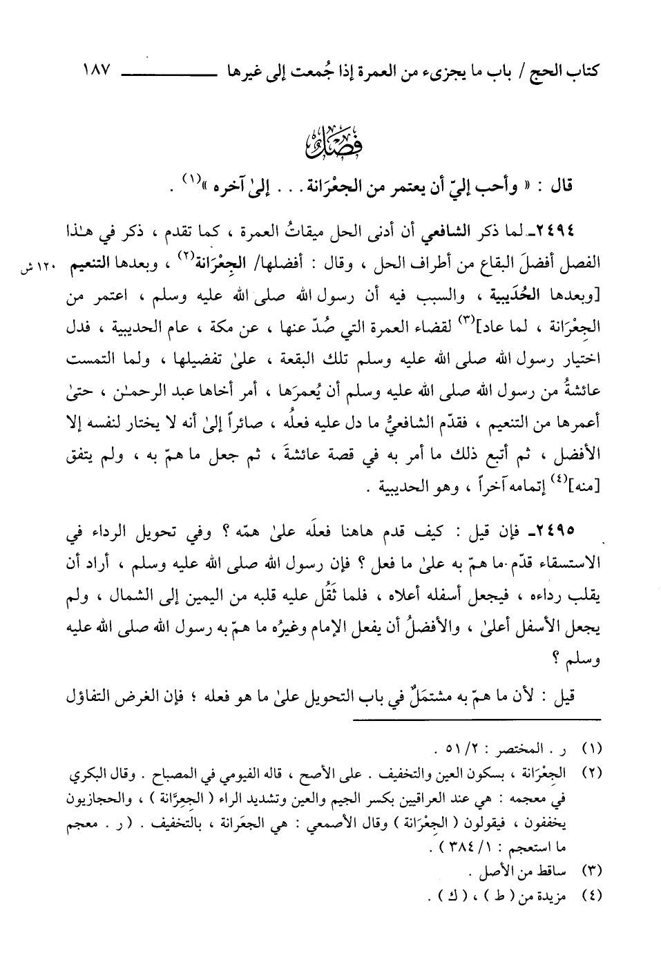 2494 - لما ذكر الشافعي أن أدنى الحل ميقاتُ العمرة، كما تقدم، ذكر في هذا الفصل أفضلَ البقاع من أطراف الحل، وقال: أفضلها الجِعْرَانة (2)، وبعدها التنعيم [وبعدها الحُدَيبية، والسبب فيه أن رسول الله صلى الله عليه وسلم، اعتمر من الجِعْرَانة، لما عاد] (3) لقضاء العمرة التي صُدّ عنها، عن مكة، عام الحديبية، فدل اختيار رسول الله صلى الله عليه وسلم تلك البقعة، على تفضيلها، ولما التمست عائشةُ من رسول الله صلى الله عليه وسلم أن يُعمرَها، أمر أخاها عبد الرحمن، حتى أعمرها من التنعيم، فقدّم الشافعيُّ ما دل عليه فعلُه، صائراً إلى أنه لا يختار لنفسه إلا الأفضل، ثم أتبع ذلك ما أمر به في قصة عائشةَ، ثم جعل ما همّ به، ولم يتفق [منه] (4) إتمامه آخراً، وهو الحديبية.