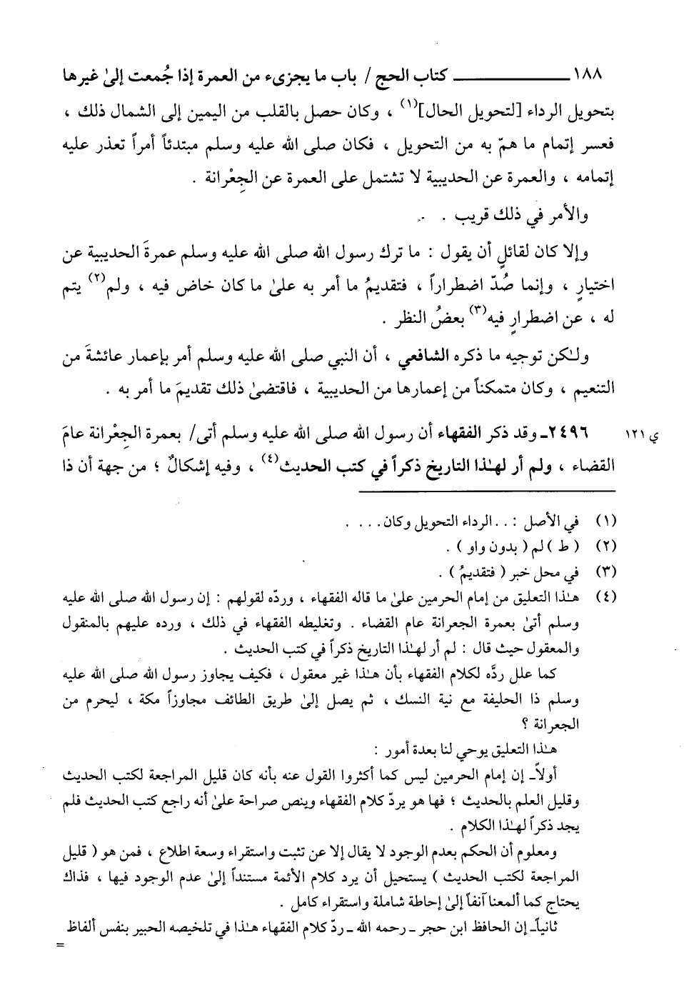 (4) هذا التعليق من إمام الحرمين على ما قاله الفقهاء، وردّه لقولهم: إن رسول الله صلى الله عليه وسلم أتى بعمرة الجعرانة عام الفضاء. وتغليطه الفقهاء في ذلك، ورده عليهم بالمنقول والمعقول حيث قال: لم أر لهذا التاريخ ذكراً في كتب الحديث.