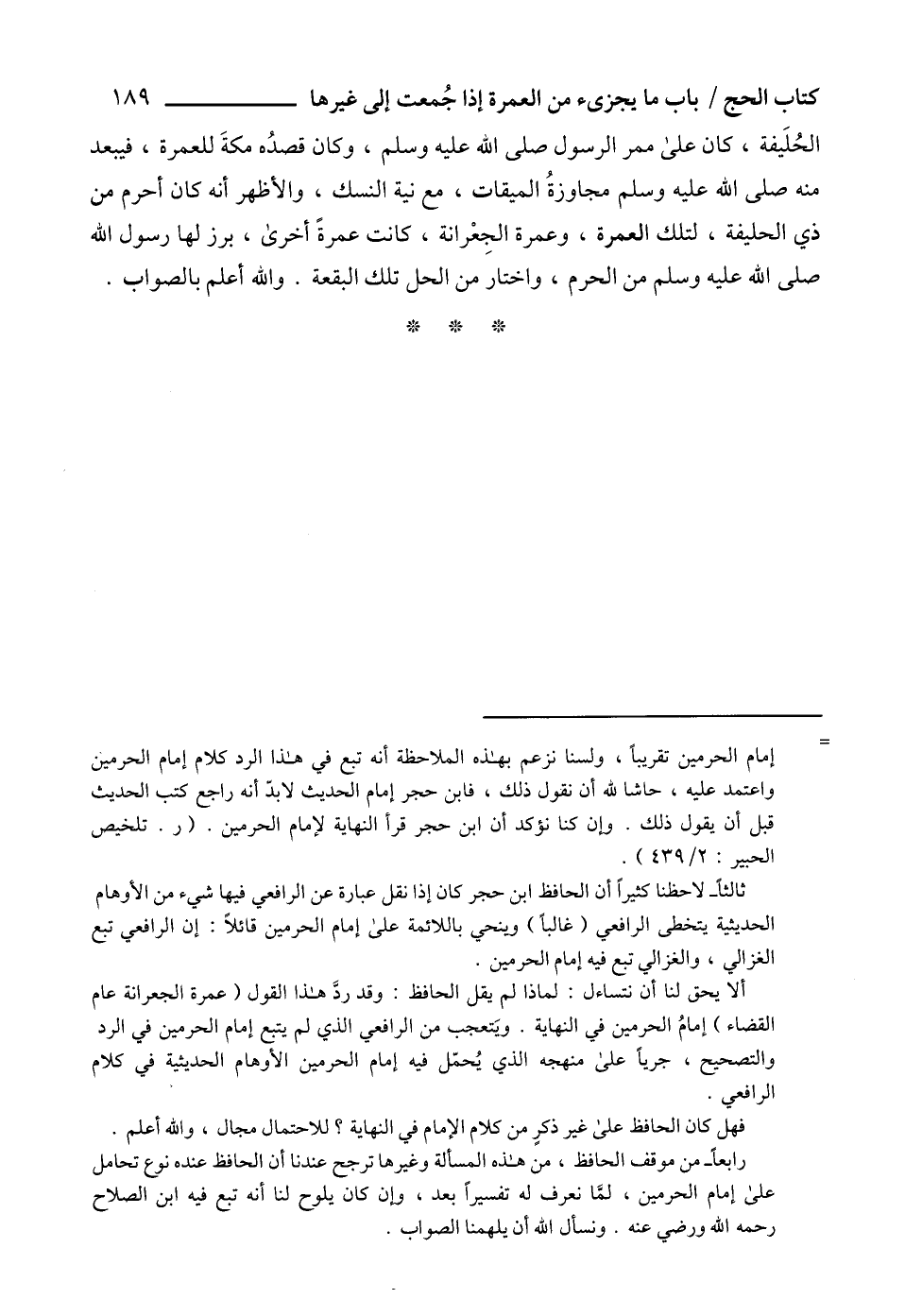 ألا يحق لنا أن نتساءل: لماذا لم يقل الحافظ: وقد ردَّ هذا القول (عمرة الجعرانة عام القضاء) إمامُ الحرمين في النهاية. ويَتعجب من الرافعي الذي لم يتبع إمام الحرمين في الرد والتصحيح، جرياً على منهجه الذي يُحمّل فيه إمام الحرمين الأوهام الحديثية في كلام الرافعي.