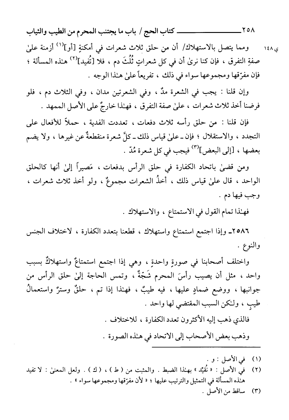 واختلف أصحابنا في صورة واحدةٍ، وهي إذا اجتمع استمتاعٌ واستهلاكٌ بسبب واحد، مثل أن يصيب رأسَ المحرم شَجّةٌ، وتمس الحاجة إلى حلق الرأس من جوانبها، ووضع ضمادٍ عليها، فيه طيبٌ، فهذا إذا تم، حلقٌ وسترٌ واستعمالُ طيبٍ، ولكن السبب المقتضي لها واحد.
