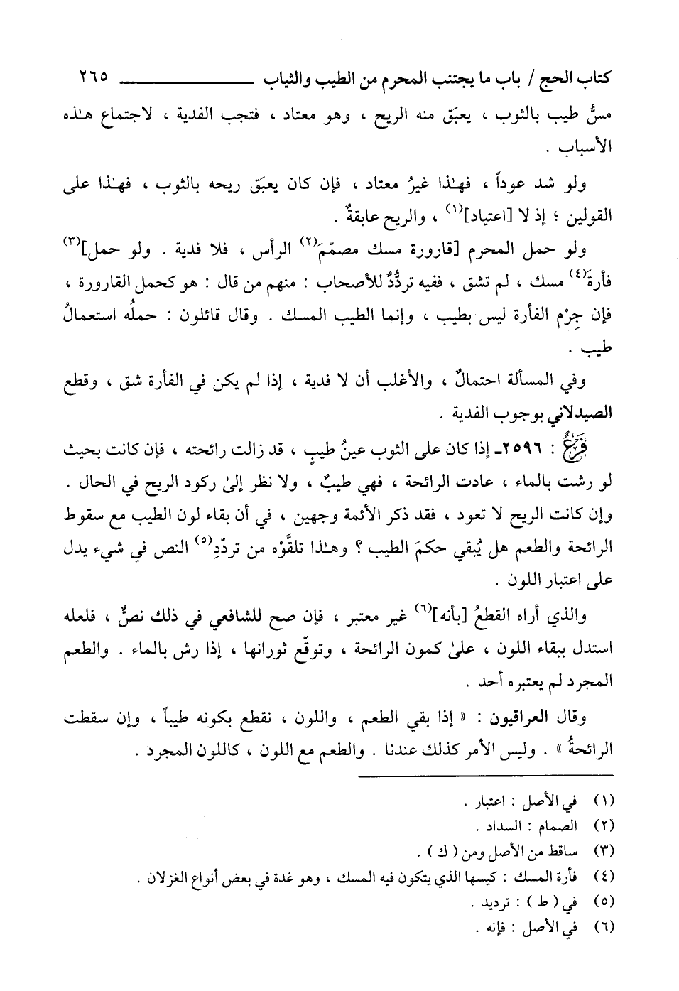 2596 - إذا كان على الثوب عينُ طيبٍ، قد زالت رائحته، فإن كانت بحيث لو رشت بالماء، عادت الرائحة، فهي طيبٌ، ولا نظر إلى ركود الريح في الحال.