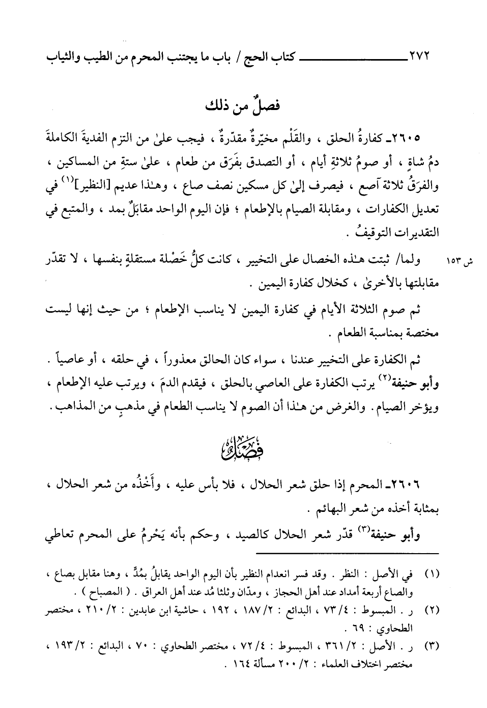 2605 - كفارةُ الحلق، والقَلْم مخيّرةٌ مقدّرةٌ، فيجب على من التزم الفديةَ الكاملةَ دمُ شاةٍ، أو صومُ ثلاثةِ أيام، أو التصدق بفَرَق من طعام، على ستةِ من المساكين، والفرَقُ ثلاثة آصع، فيصرف إلى كل مسكين نصف صاع، وهذا عديم [النظير] (1) في تعديل الكفارات، ومقابلة الصيام بالإطعام؛ فإن اليوم الواحد مقابَلٌ بمد، والمتبع في التقديرات التوقيفُ.