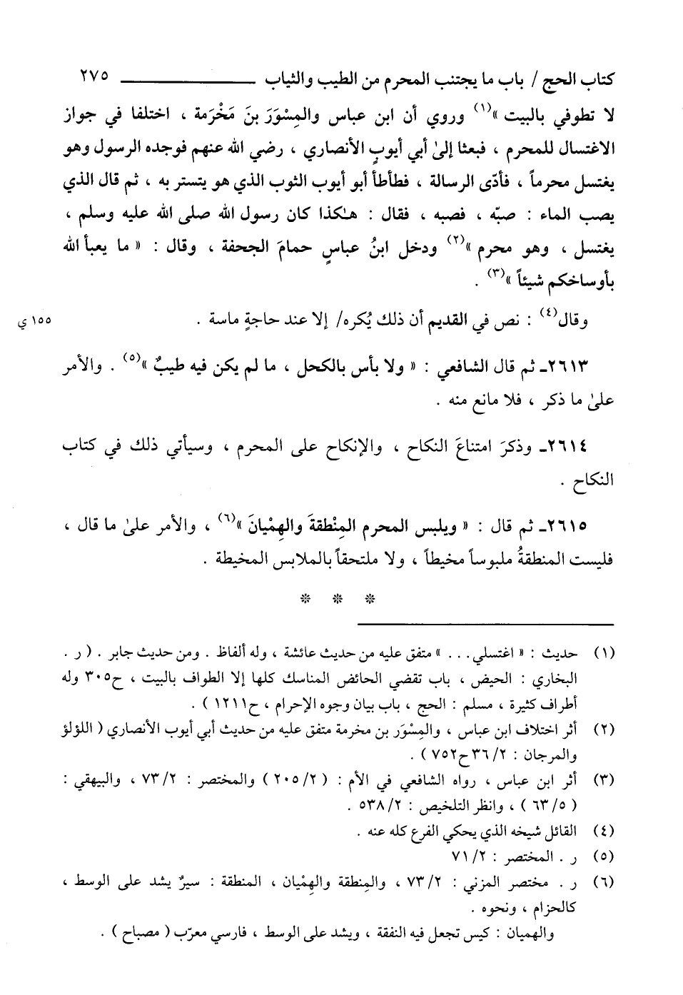 2615 - ثم قال: " ويلبس المحرم المِنْطقةَ والهِمْيانَ " (6)، والأمر على ما قال، فليست المنطقةُ ملبوساً مخيطاً، ولا ملتحقاً بالملابس المخيطة.