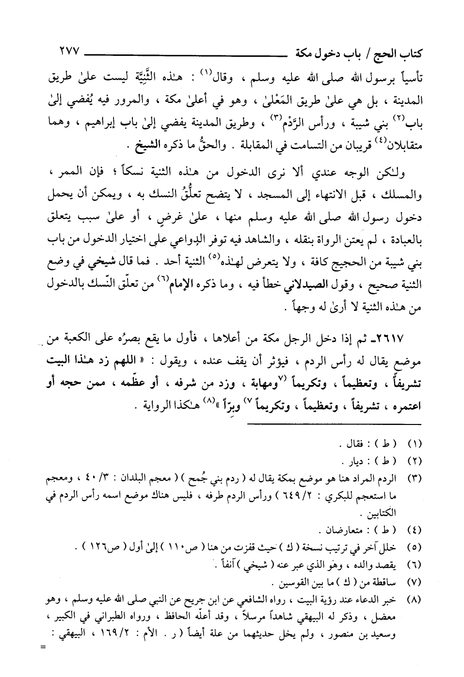 2617 - ثم إذا دخل الرجل مكة من أعلاها، فأول ما يقع بصرُه على الكعبة من موضعٍ يقال له رأس الردم، فيؤثر أن يقف عنده، ويقول: " اللهم زد هذا البيت تشريفاً، وتعظيماً، وتكريماً (7 ومهابة، وزد من شرفه، أو عظّمه، ممن حجه أو اعتمره، تشريفاً، وتعظيماً، وتكريماً 7) وبِرّاً " (8) هكذا الرواية.