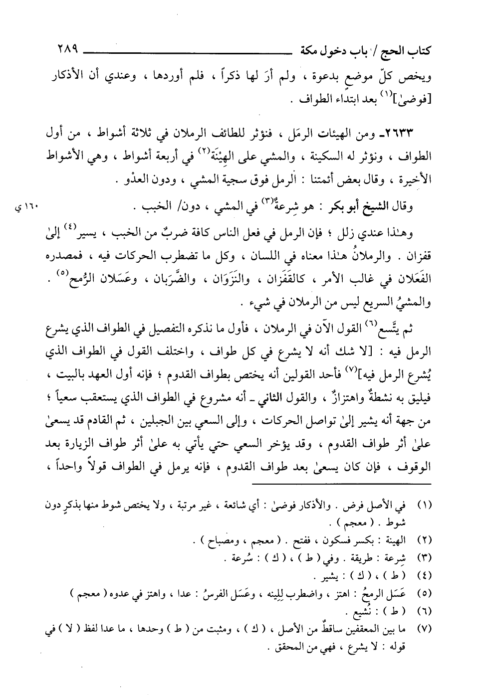 2633 - ومن الهيئات الرمَل، فنؤثر للطائف الرملان في ثلاثة أشواط، من أول الطواف، ونؤثر له السكينة، والمشي على الهِيْنَة (2) في أربعة أشواط، وهي الأشواط الأخيرة، وقال بعض أئمتنا: الرمل فوق سجية المشي، ودون العدْو.