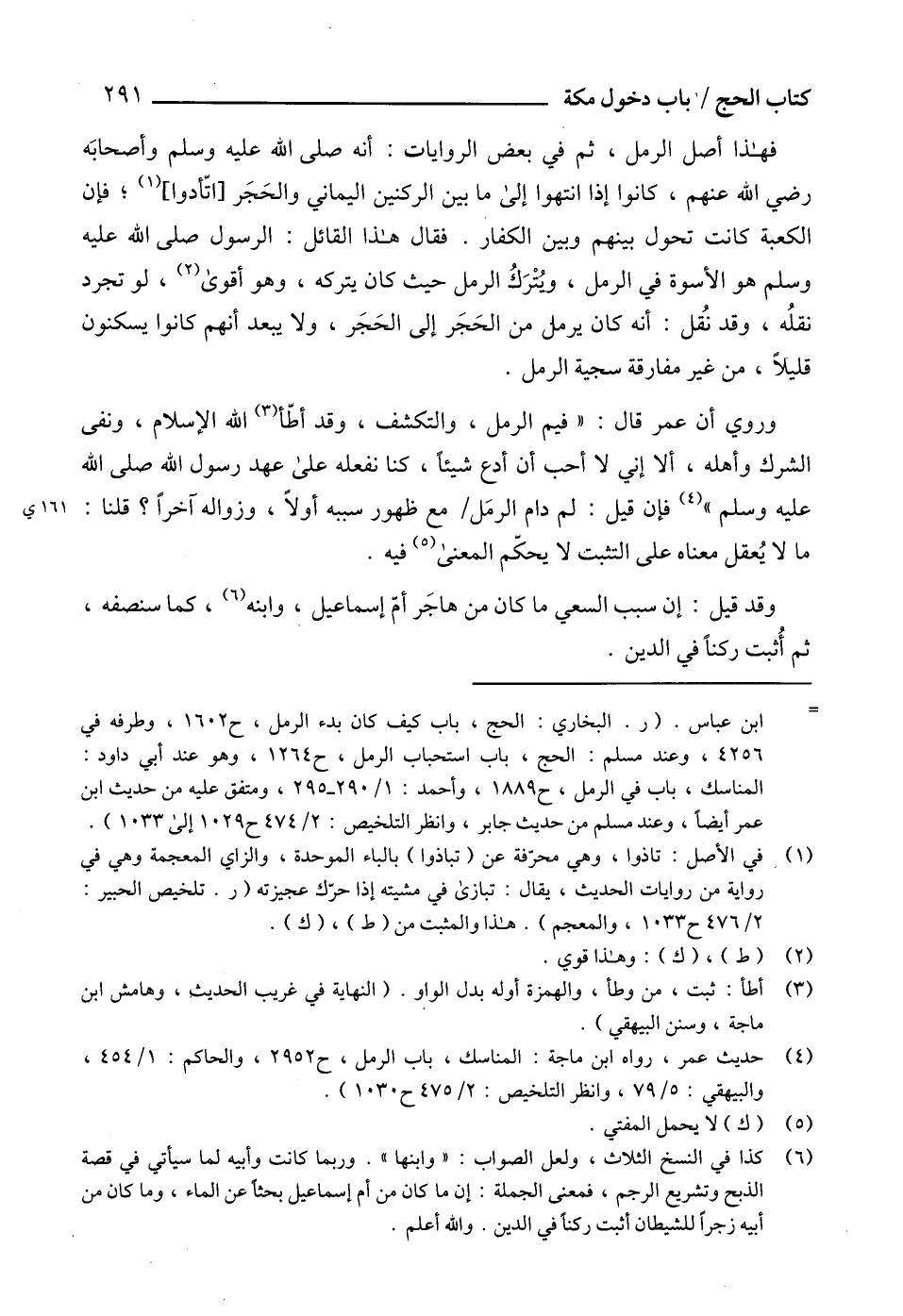 (4) حديث عمر، رواه ابن ماجة: المناسك، باب الرمل، ح 2952، والحاكم: 1/ 454، والبيهقي: 5/ 79، وانظر التلخيص: 2/ 475 ح 1030).
