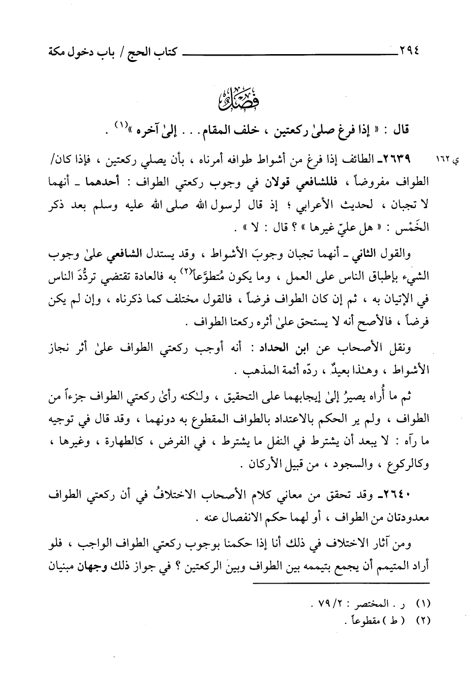 2639 - الطائف إذا فرغ من أشواط طوافه أمرناه، بأن يصلي ركعتين، فإذا كان الطواف مفروضاً، فللشافعي قولان في وجوب ركعتي الطواف: أحدهما - أنهما لا تجبان، لحديث الأعرابي؛ إذ قال لرسول الله صلى الله عليه وسلم بعد ذكر الخَمْس: " هل عليّ غيرها "؟ قال: لا ".