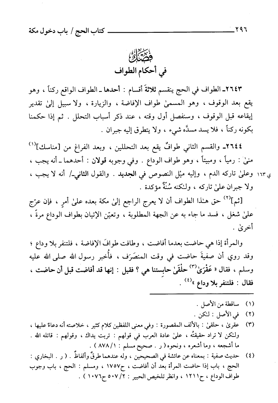 (4) حديث صفية: بمعناه عن عائشة في الصحيحين، وله عندهما طرقٌ وألفاظٌ. (ر. البخاري: الحج، باب إذا حاضت المرأة بعد أن أفاضت، ح 1757، ومسلم: الحج، باب وجوب طواف الوداع، ح 1211، وانظر تلخيص الحبير: 2/ 507 ح 1076).